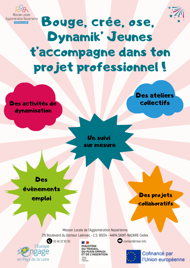 🎉 DYNAMIK'JEUNE, nouveau dispositif d’accompagnement collectif et individualisé destiné aux jeunes, à la Mission Locale de l'Agglomération Nazairienne, visant à prendre confiance, donner l'envie de s'investir, et construire un projet d’insertion sociale et professionnelle.